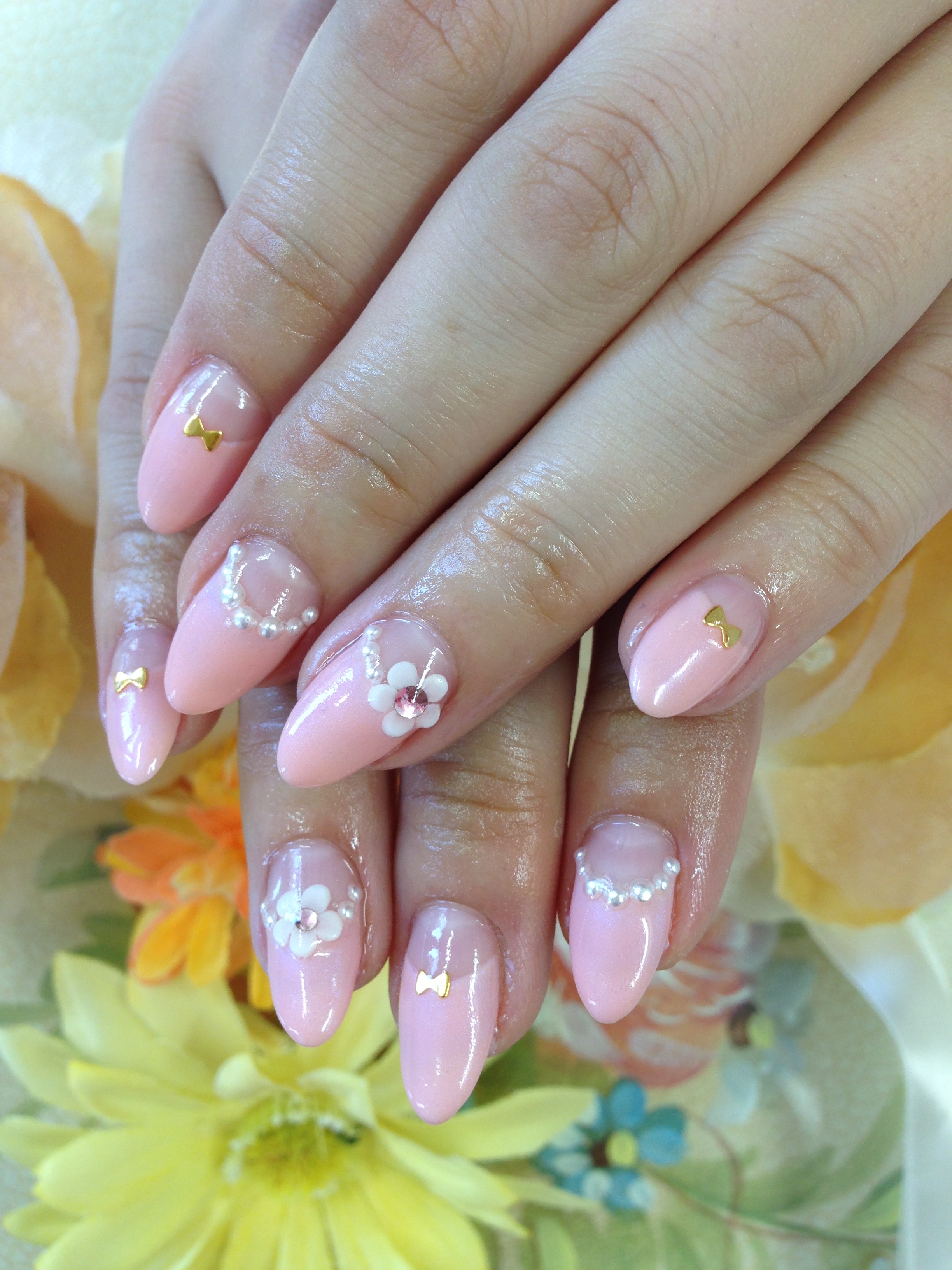 ピンクにパール、白いお花。